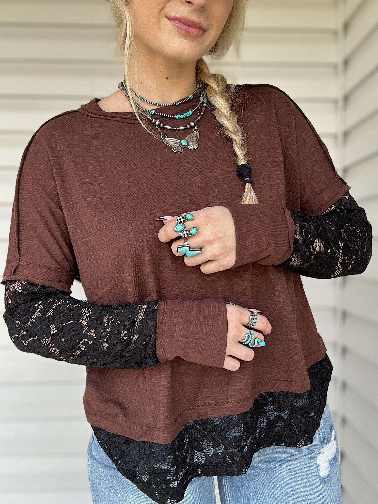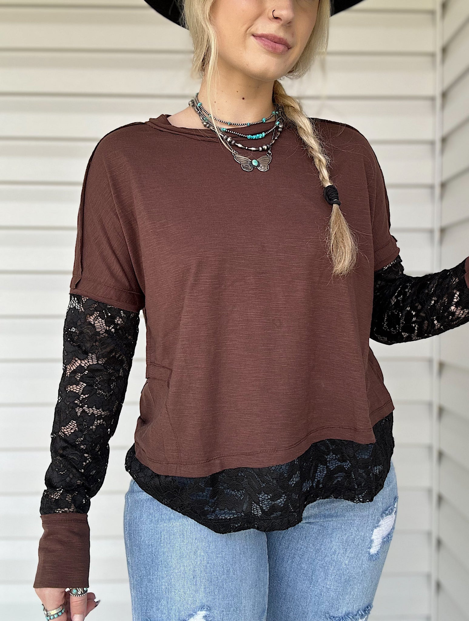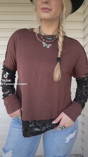 - Chocolate brown colored top with black lace detailing